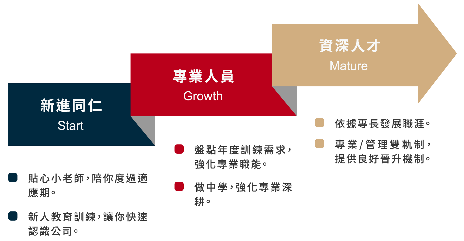 依據各類人員職務需求,規劃培訓體系。